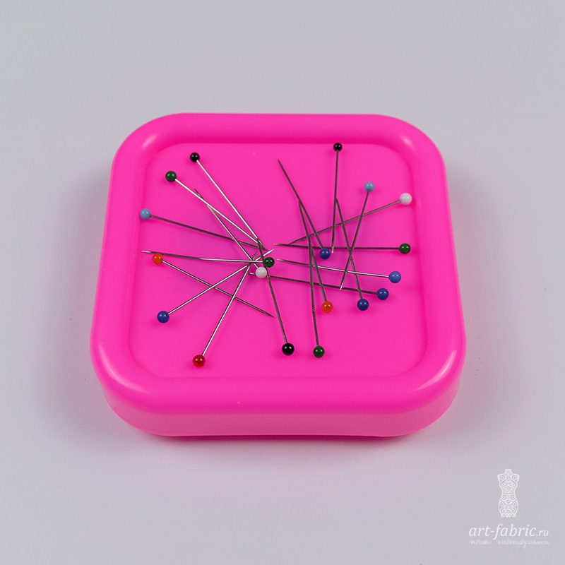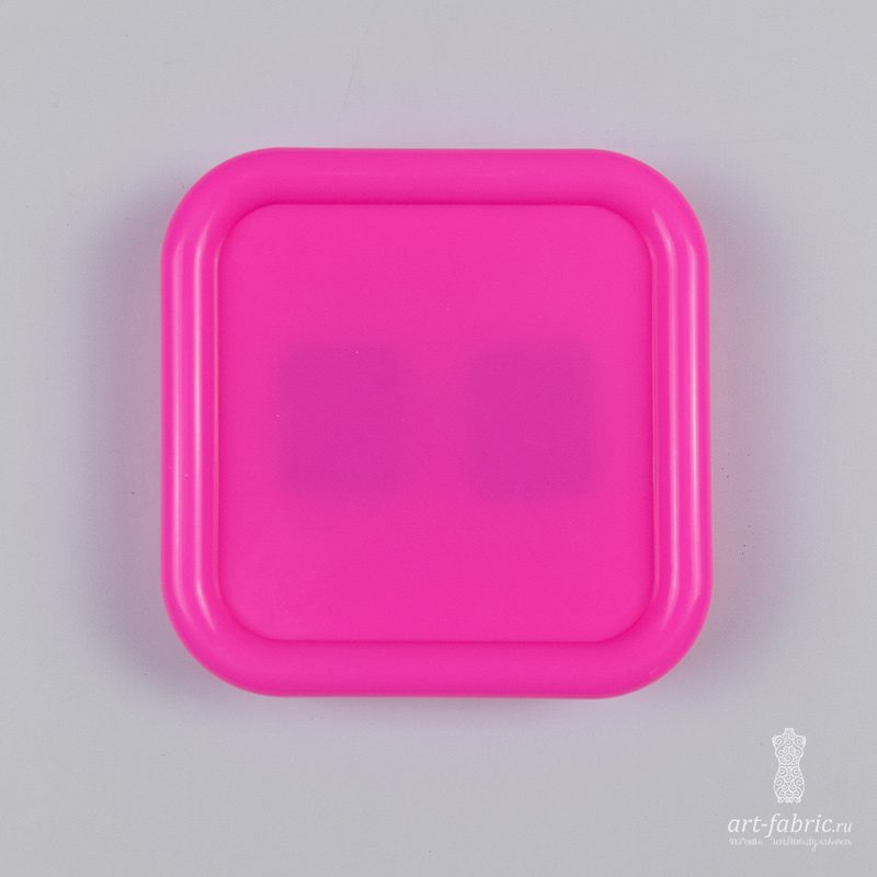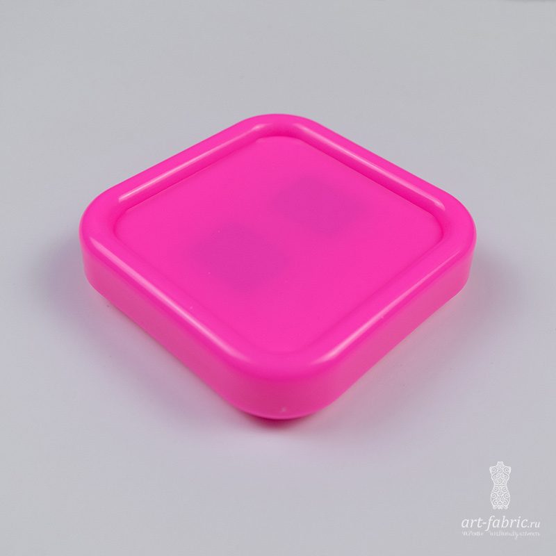 Магнитная игольница розового цвета и обтекаемо-квадратной формы 9*9 см с возвышающимся бортиком по контуру. Высота боковой стороны 2,5 см.