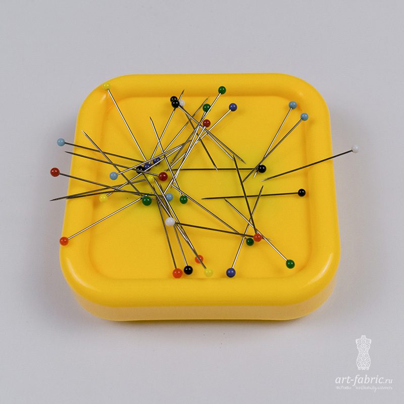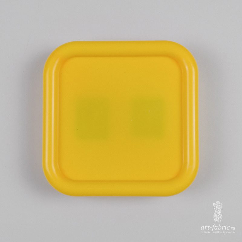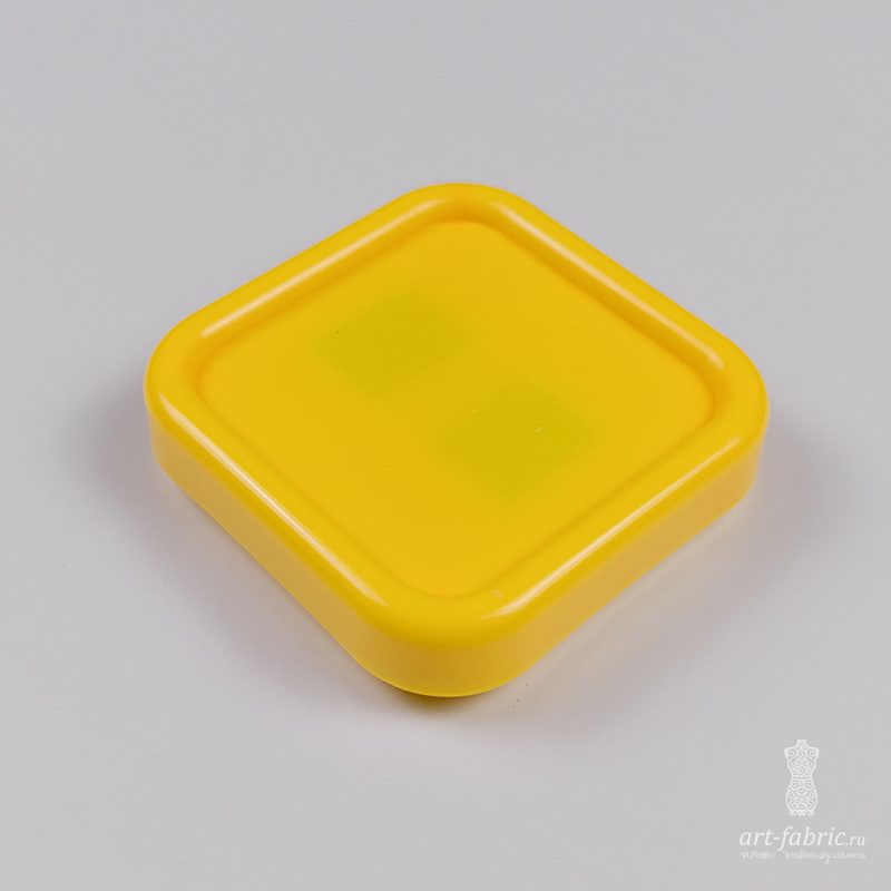 Магнитная игольница желтого цвета и обтекаемо-квадратной формы 9*9 см с возвышающимся бортиком по контуру. Высота боковой стороны 2,5 см.
