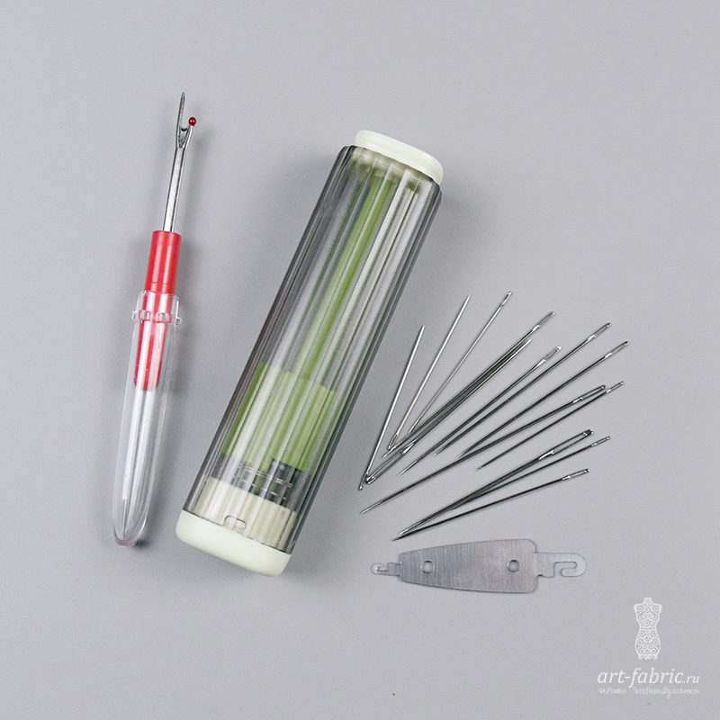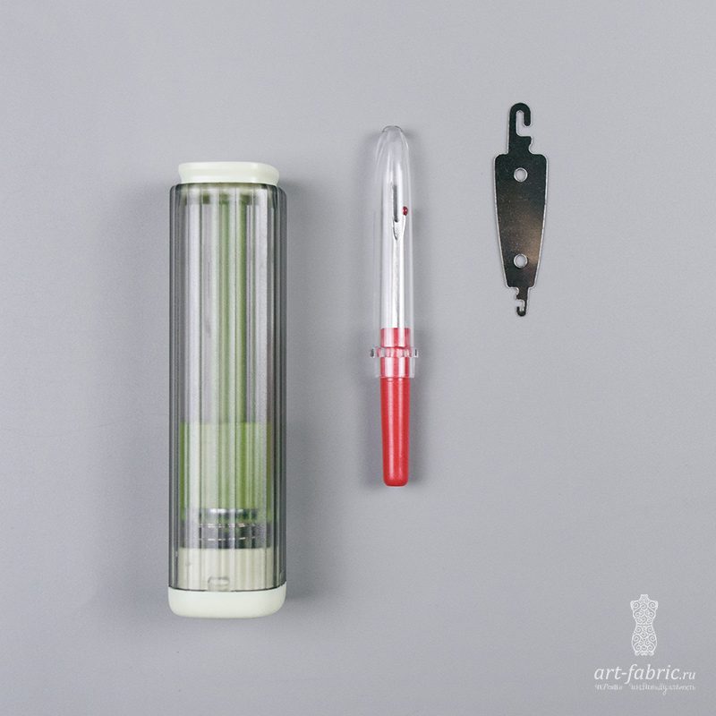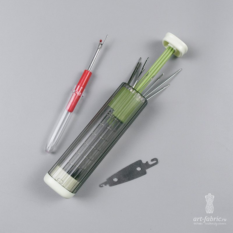 Футляр для хранения иголок зеленого цвета с кнопкой-крышкой и с магнитной подушкой внутри, обеспечивающей более удобную эксплуатацию инструментов. В комплект также входят иглы разных размеров, вспарыватель и нитевдеватель. Размеры игольницы - 10*2,6*2,6 см.