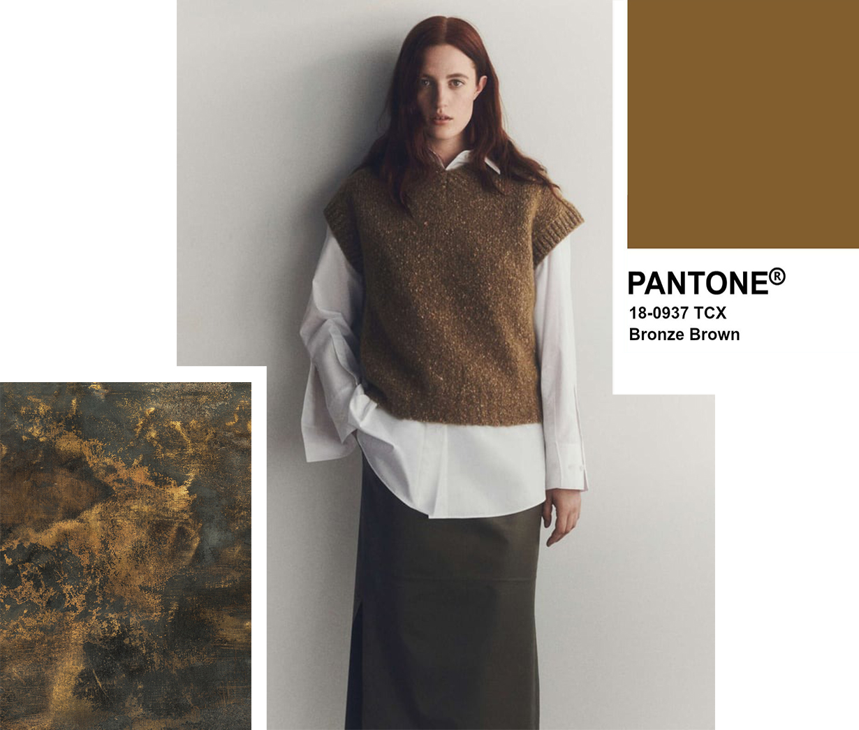 Заключает коллекцию ключевых пантонов «Бронзовый карий» - землисто-золотистый оттенок с горчичными нотками.