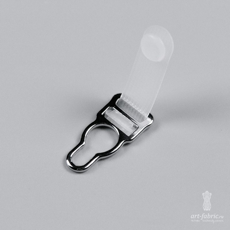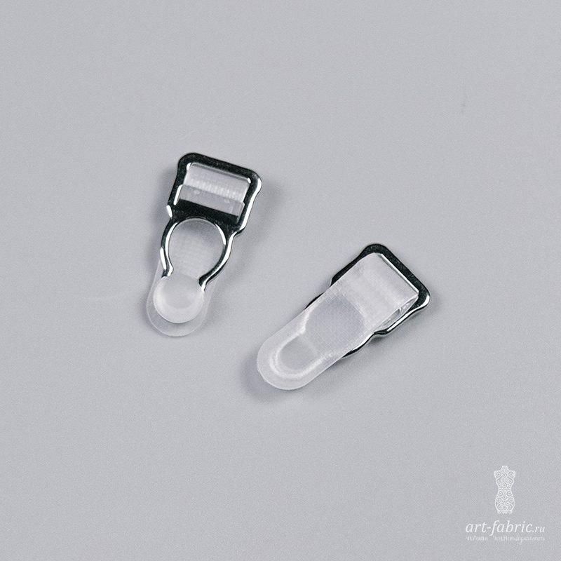 Застежка для крепления чулок из сплава с двойным покрытием цвета серебра, с защитой от пота и коррозии, в качестве застежки - прорезиненная прозрачная ленты, ширина внутреннего отверстия 10 мм, используется в поясах-чулкодержателях и грациях.